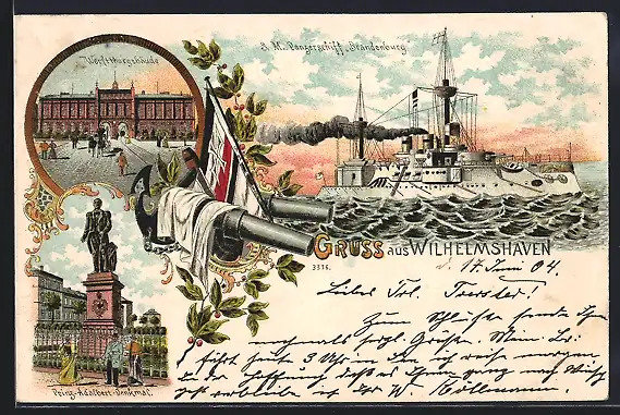 Lithographie Wilhelmshaven, Werfttorgebäude, Prinz-Adalbert-Denkmal, S. M. Panzerschiff Brandenburg