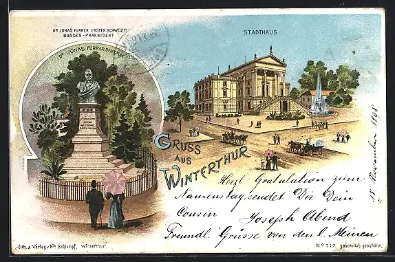 Lithographie Winterthur, Stadthaus, Dr. Jonas Furrer-Denkmal, Pferdekutschen