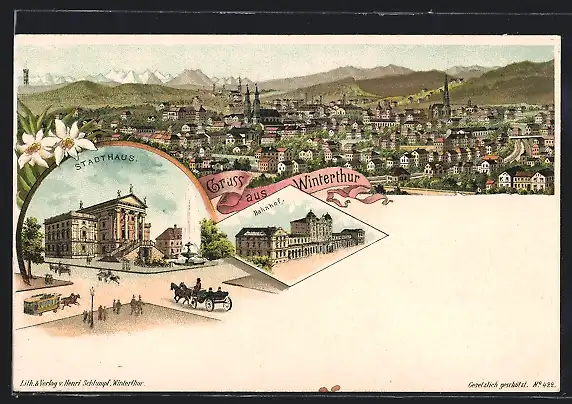 Lithographie Winterthur, Teilansicht, Stadthaus, Bahnhof