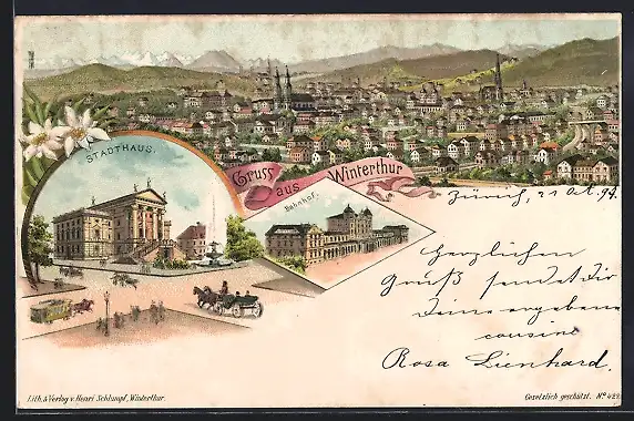 Lithographie Winterthur, Teilansicht, Stadthaus, Bahnhof