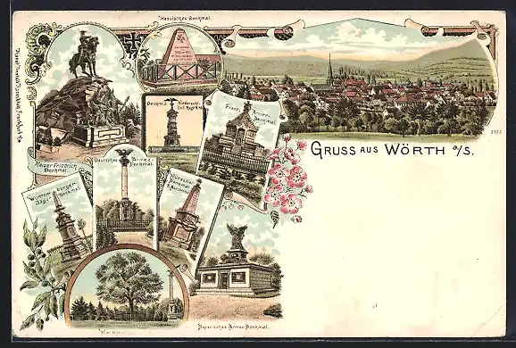 Lithographie Wörth a/S, Hessisches Denkmal, Württemberger Jägerdenkmal, Franz. Armee-Denkmal