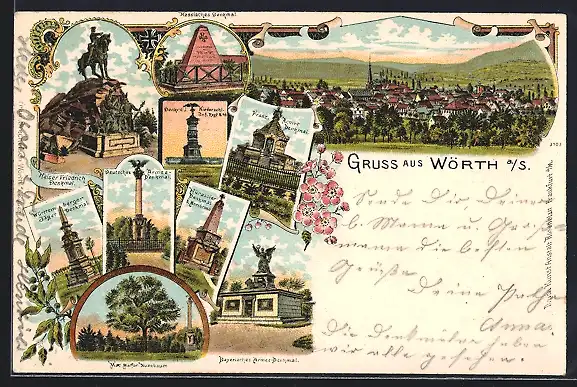 Lithographie Wörth a/S, Hessisches Denkmal, Württemberger Jägerdenkmal, Franz. Armee-Denkmal