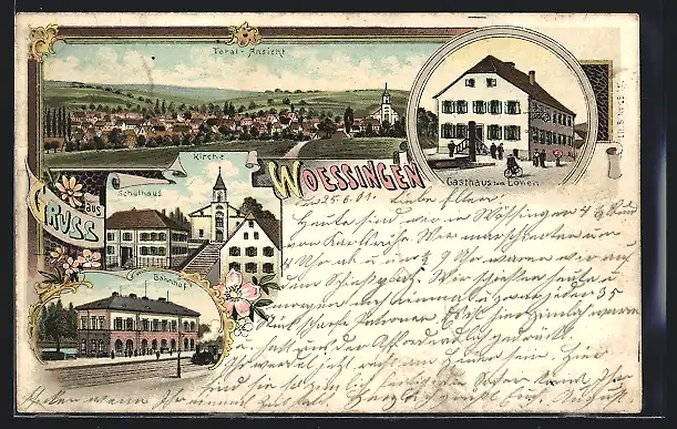 Lithographie Wössingen, Gasthaus zum Löwen, Bahnhof, Schulhaus