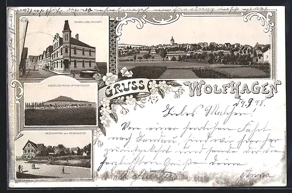 Lithographie Wolfhagen, Restaurant zum Rosengarten, Kaiserliches Postamt, Weidelsburg und Totalansicht