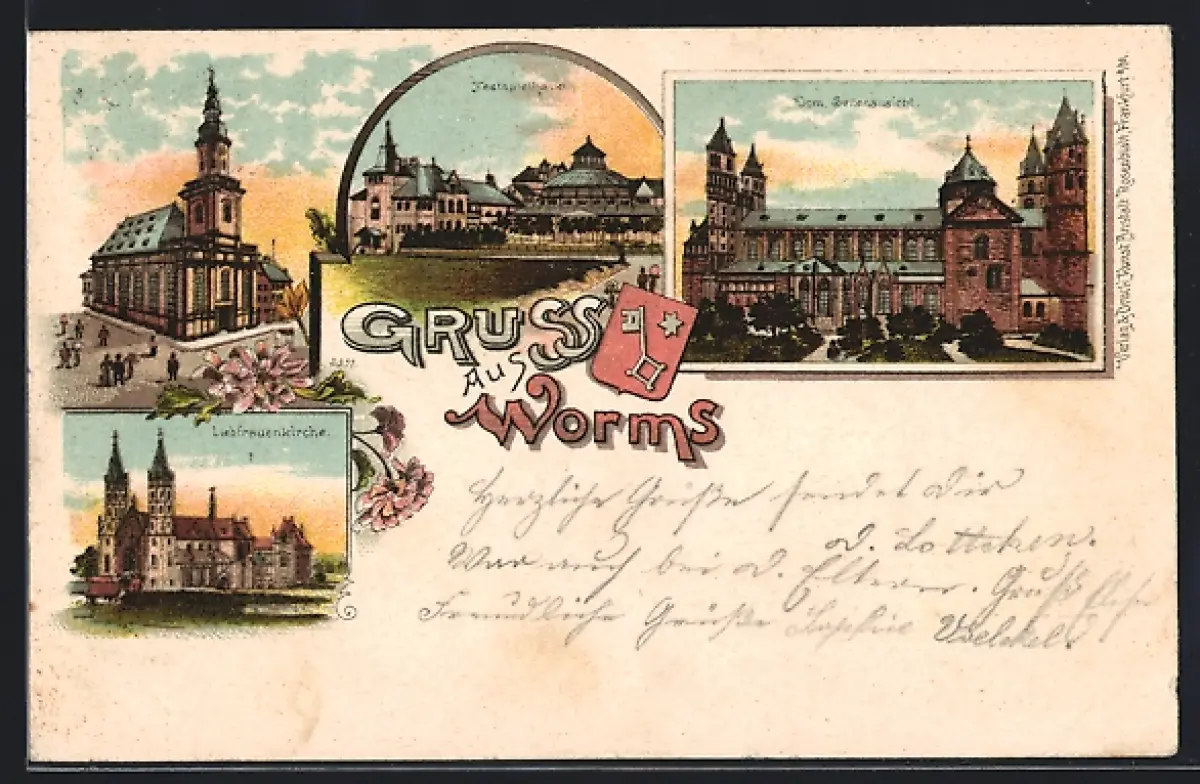 Lithographie Worms, Festspielhaus, Liebfrauenkirche, Dom von der Seitenansicht