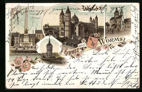 Lithographie Worms, Ludwig-Denkmal, Dom, Paulus-Museum, Wasserturm