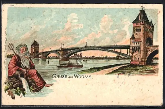Lithographie Worms, Uferpartie mit Brücke, Neptun