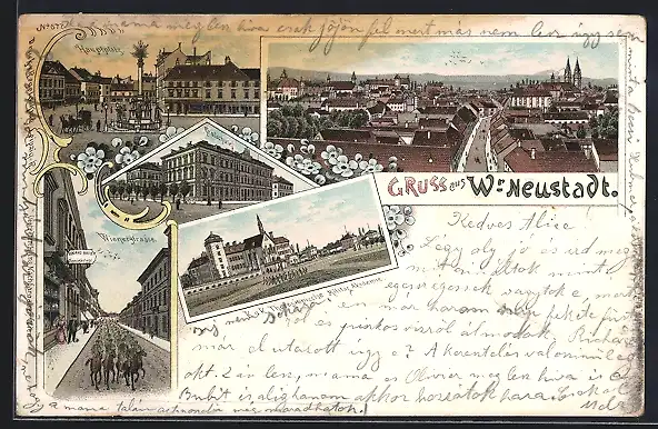 Lithographie Wr. Neustadt, Wienerstrasse, Hauptplatz und Realschule