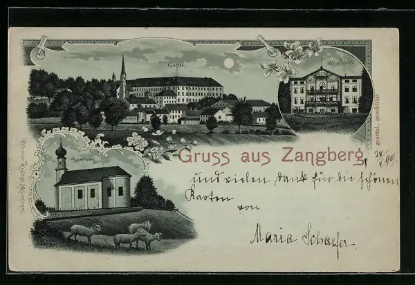 Lithographie Zangberg, Villa Riedl, Palmberg, Kloster