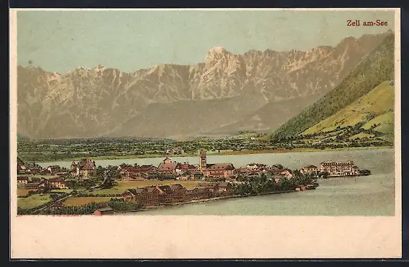 Lithographie Zell am See, Ansicht mit den Bergen