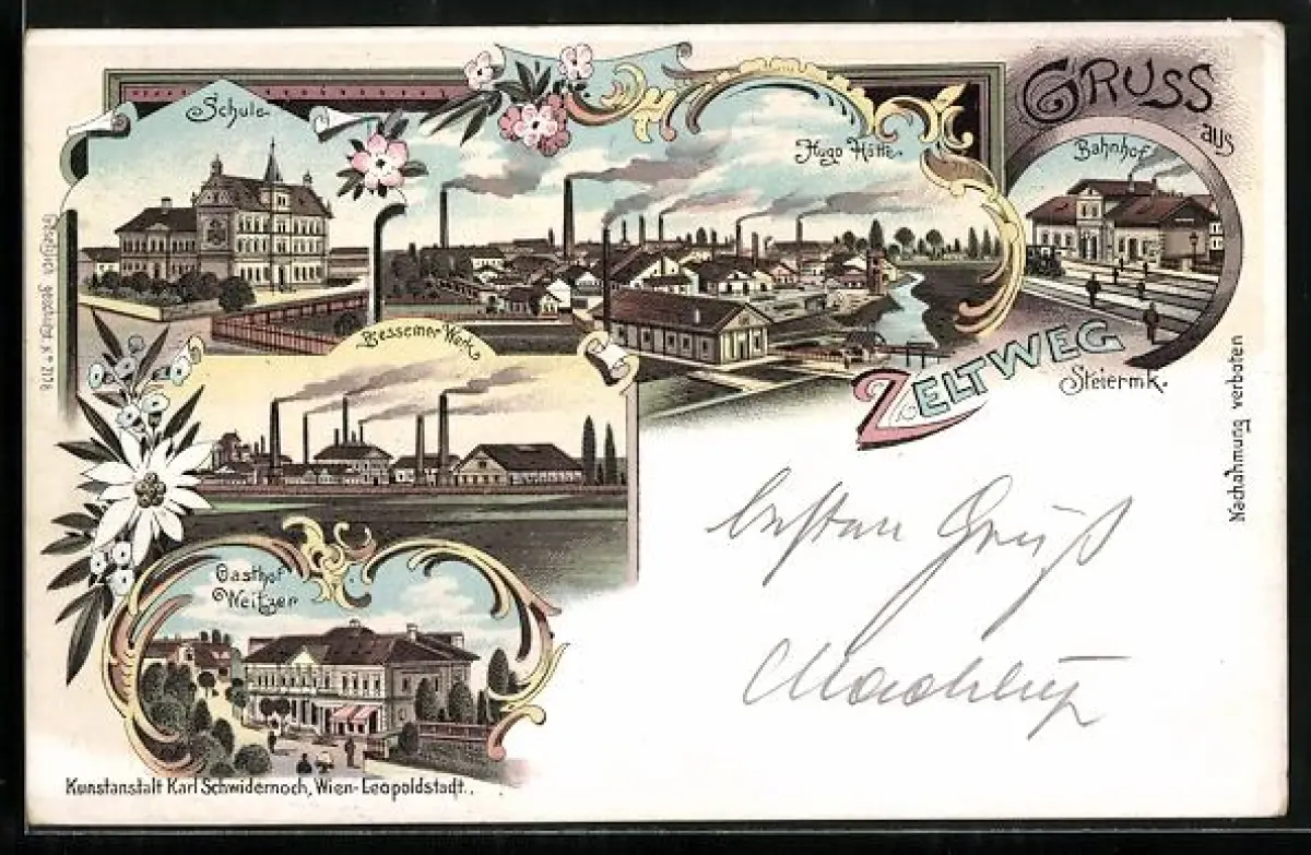 Lithographie Zeltweg /Steiermark, Gasthof Weitzer, Bahnhof, Hugo Hütte, Schule
