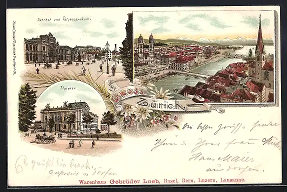 Lithographie Zürich, Bahnhof und Polytechnikum, Theater, Ortsansicht