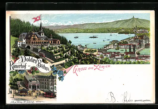 Lithographie Zürich, Dolder Bahn an Haltestelle Römerhof mit Wasserpartie