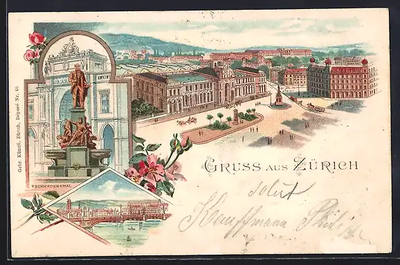 Lithographie Zürich, Escherdenkmal, Flussbrücke, Hauptplatz