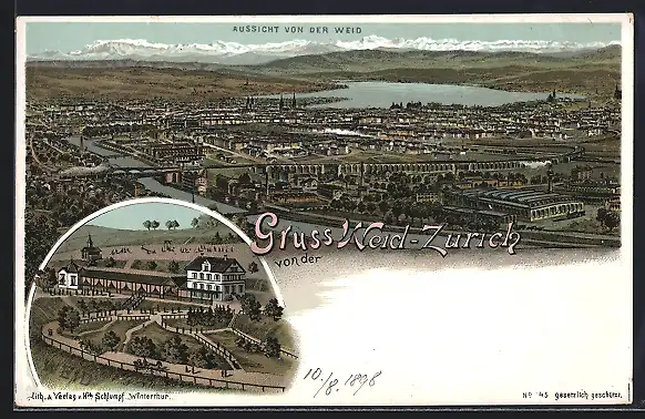 Lithographie Zürich, Gasthof auf der Weid, Aussicht von der Weid