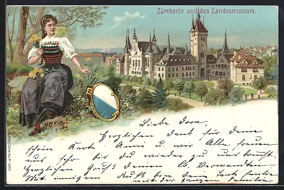 Lithographie Zürich, Landesmuseum mit Frau in Tracht