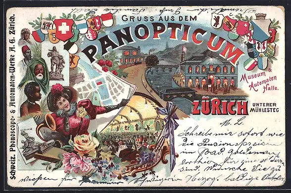 Lithographie Zürich, Panopticum, Unterer Mühlesteg, Museum & Automatenhalle
