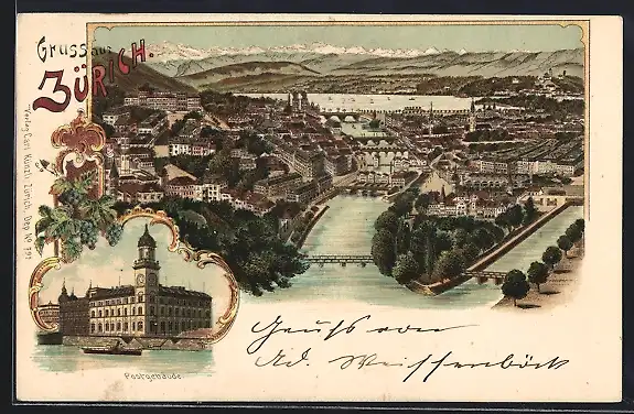 Lithographie Zürich, Postgebäude, Panoramablick auf Stadt und See