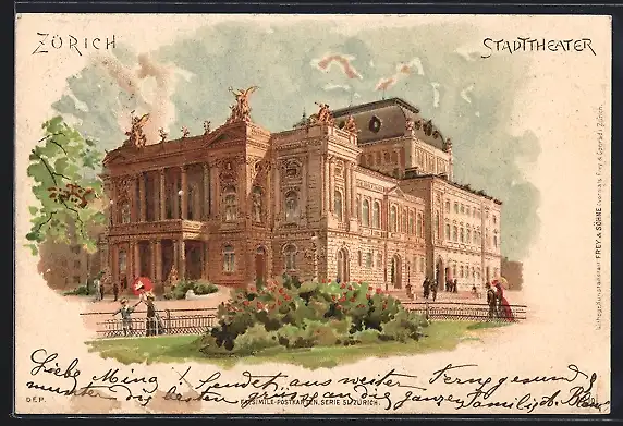 Lithographie Zürich, Stadttheater vor Park aus auf Eckfassade mit Säuleneingang