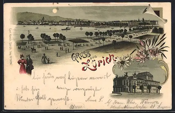 Lithographie Zürich, Theater und Flusspartie im Mondschein