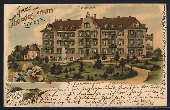 Lithographie Zürich, Theodosianum, Fontäne, Blumen