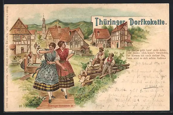 Lithographie thüringer Dorfkokette, zwei Frauen in thüringischer Tracht