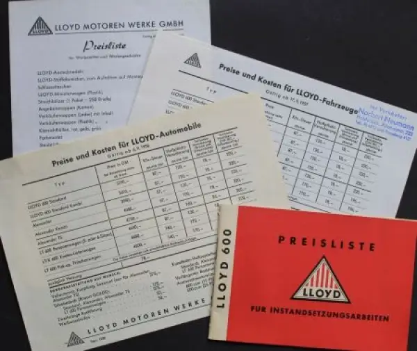 Zustand: 2Lloyd Automobile Preislisten:9/1956, 9/1957, 9/1958, Instandsetzungen
