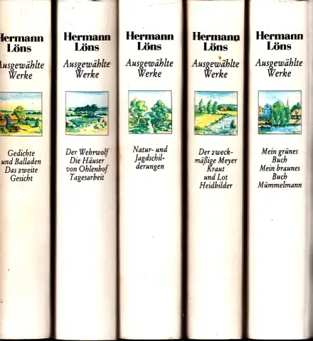 die Seitenschnitt und Einbände sind altersbedingt fleckig, aus dem Inhalt: Band I: Mein grünes Buch - Mein braunes Buch - Mümmelmann. Band II: Der zweckmäßige Meyer - Kraut und Lot (Auswahl) - Heidbilder (Auswahl). Band III: Da draußen vor der Tür (Auswahl) - Wasserjungfern - ein buntes Buch (Auswahl) - Widu (Auswahl) - Aus Forst und Flur (Auswahl) - -Was da kreucht und fleugt (Auswahl) Auf der Wildbahn (Auswahl) - Ho Rüd`höh! (Auswahl). Band IV: Der Wehrwolf - Die Häuser von Ohlenhof - Tagesarbeit: Die Sonntagsplaudereien des Fritz von der Leine (Auswahl). Band V: fedichte und Balladen aus: Mein goldenes Buch - Mein blaues Buch - Der kleine Rosengarten - Das zweite Gesicht - Nachwort Beschreibung vom Antiquariat Ardelt 4o1a ISBN-Nummer: 3893503021 Antiquariat Ardelt