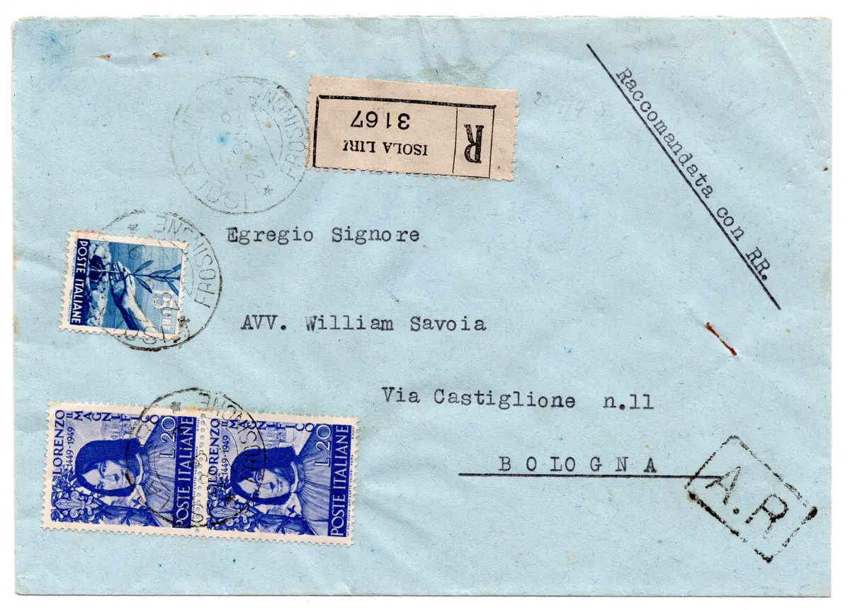 Umschlag - Lorenzo der Prächtige Nr. 608 Paar + Ergänzung Nr. 560 auf Umschlag Racc. nach Bologna am 28.9.49 - im Tarif Cod. 314/17