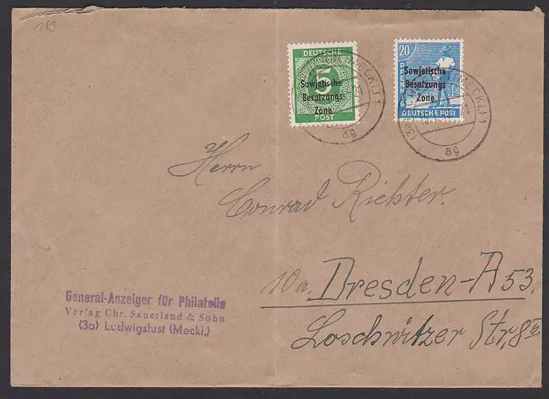 Ludwigslust (Meckl) Fernbrief 15.1.49 SBZ MiF Ziffern EA II, Abs. General-Anzeiger für Philatelie