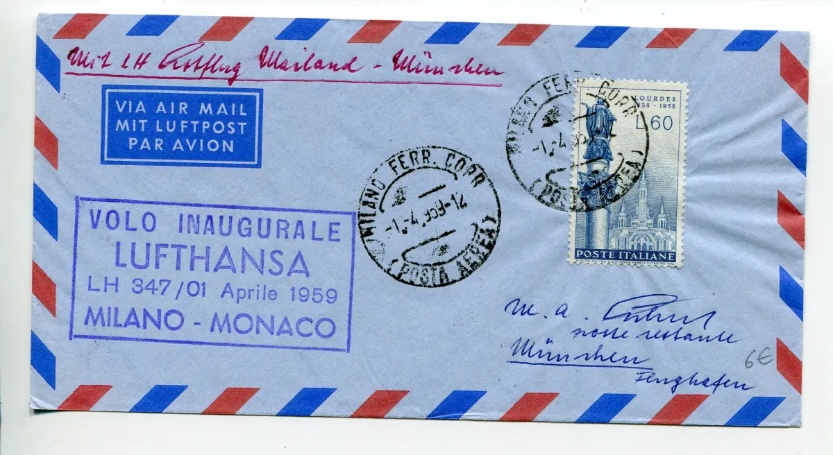 Lufthansa Mailand/München vom 1.4.59 - Aerogramm des Erstfluges - Lufthansa Mailand/München vom 1.4.59 - Aerogramm mit Ann. Flugspezial (Kat. Pellegrini Nr. 931) Code 484/11