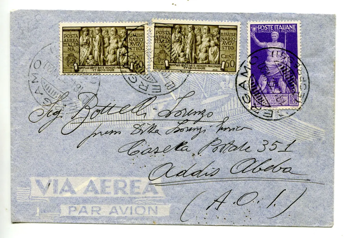 - Luftpost August Cent. 50 Nr. 107 zwei Exemplare + ergänzende P.A. Nr. 421 auf Luftumschlag für die A.O.I. am 18.12.37 - schön und ungewöhnlich - Kat. Euro? 120 n. 360/A