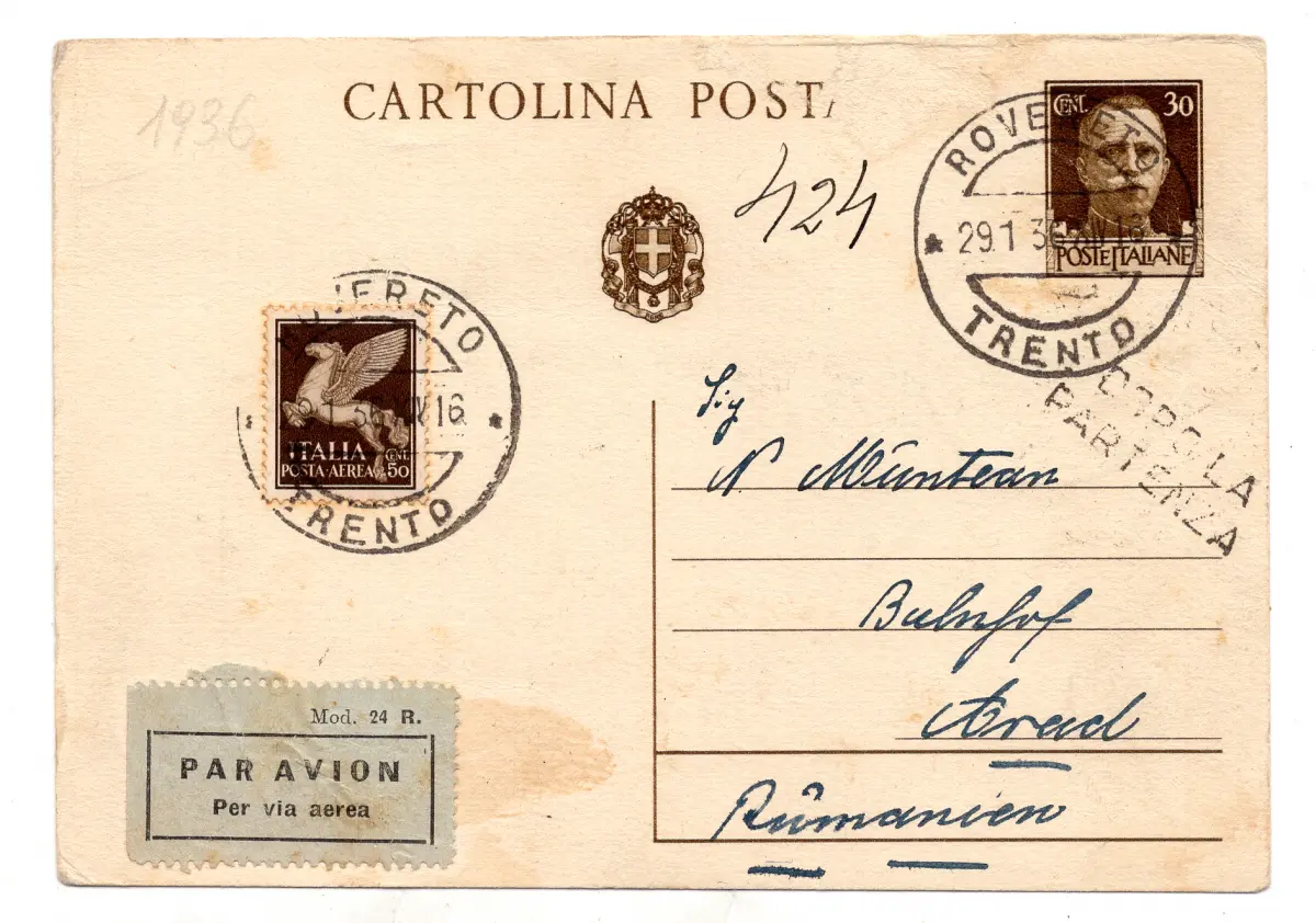 - Luftpost Cent. 50 Nr. 11 auf C.P. Cent. 30 Kaiserreich auf dem Luftweg von Rovereto nach Arad (Rumänien) am 29.1.36 - hinten Ann. von Transit und Ankunft - die Postkarte hat oben einen Defekt (Abrieb) - Ungewöhnliche Verwendung und Bestimmungs-Nr. 188/18