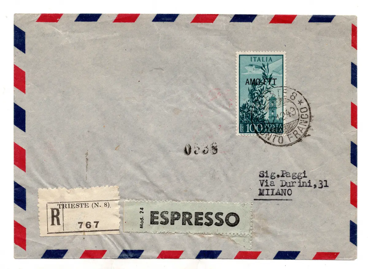 Luftpost Lire 100 Kapitol isoliert auf Umschlag Racc. exp - Luftpost Lire 100 Kapitol Nr. 23 isoliert auf Umschlag Racc. exp. von Triest (Punto Franco) nach Mailand am 12.12.49 Nr. 1115/20