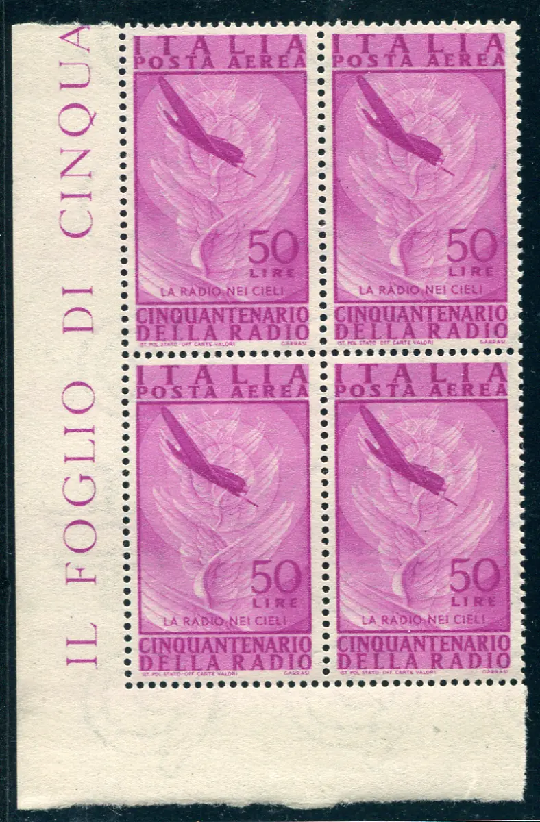 Luftpost Radio Lire 50 Viertel mit filigranen Buchstaben Vollgummi MNH - Luftpost Radio Lire 50 Nr. 141 Viertel a. von f. mit filigranen doppelreihigen Vollbuchstaben, enger Abstand auf zwei unteren Exemplaren - Interessant - Kat. 300 Cod. 761/15