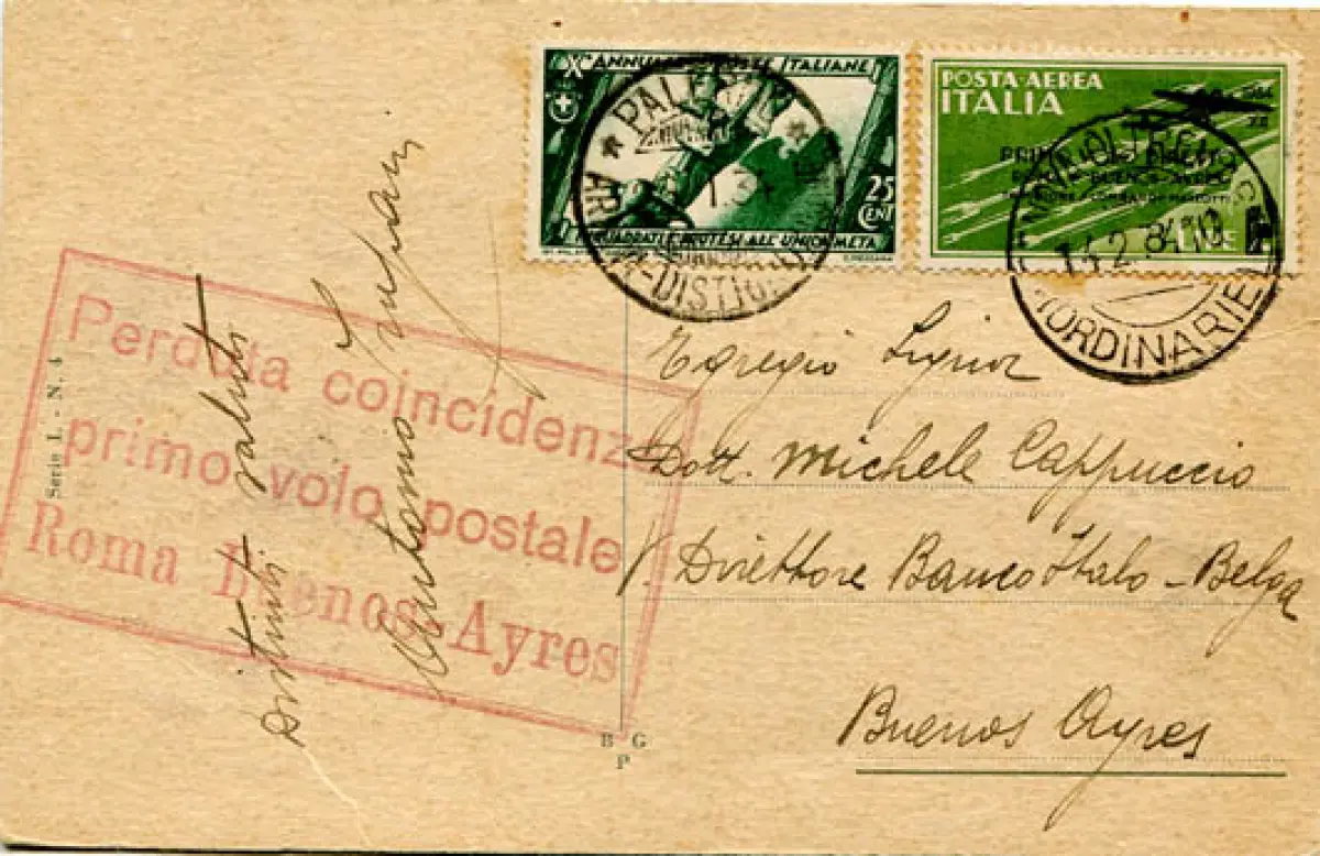 Luftpost Rom Buenos Aires 3 Lire auf Postkarte Postkarte - Luftpost Rom Buenos Aires 3 Lire Nr. 57 + ergänzende Post Nr. 329 auf Postkarte von Palermo nach Buenos Aires am 26.1.34 nach der Abreise in Rom eingetroffen - seitlich roter Sonderstempel Verlorener Anschluss erster Postflug - Postkarte wohl auf dem Seeweg ans Ziel geschickt (siehe Anmerkung Kat. Longhi Nr. 3087) - Rare Cod. 46/13