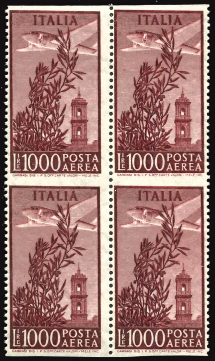 Luftpost l. 1.000 Sortenkapitol nicht gezahnt. horizontal Vollgummi MNH - Luftpost l. 1.000 Kapitol Nr. 145b Viererblock waagerecht ungezähnt - Ungewöhnlich - Kat. euro 700 Cod. 745/16