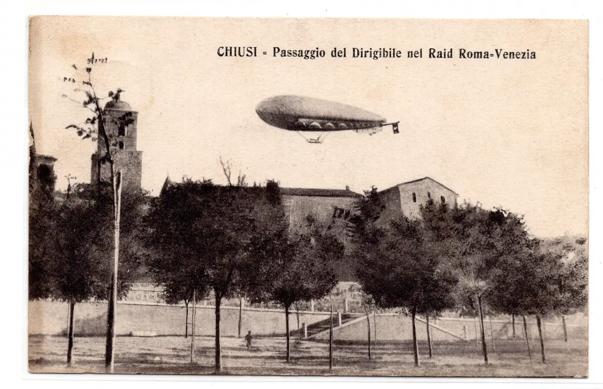C - Geschlossene Luftschiffpassage beim Überfall Rom/Venedig - Monochrome Postkarte mit Blick auf das Luftschiff im Flug über die Stadt Chiusi, gereist am 5.2.1916 - sehr guter Erhaltungszustand - Selten Cod.163/182