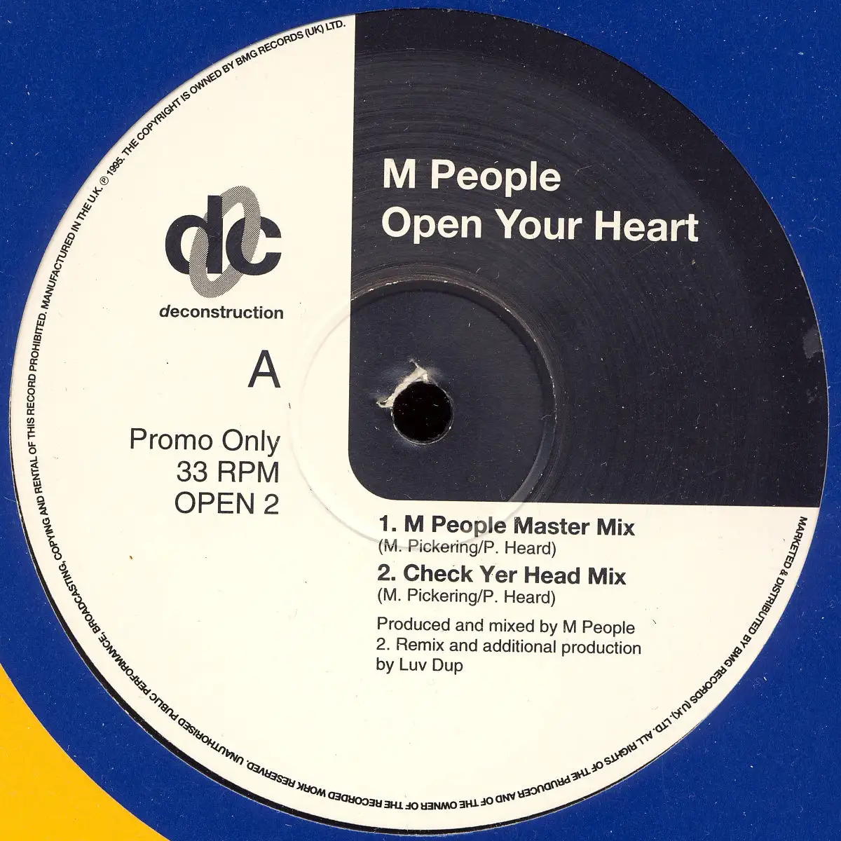 12" Maxi M People - Open Your Heart, Einheitscover der Plattenfirma, Promo, Zustand Platte M- Hülle M-; Made in United Kingdom 1995 Deconstruction OPEN 2, Tracks Fire Island Mix, Roach Motel Mix, Check Yer Head Mix, M People Master MIx