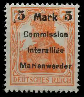 5 Mark auf 7 1/2 Pfg Wert aus der Aufdruckausgabe Marienwerder auf den Freimarken des deutschen Reiches (Germania 1916/1918) - Aufdruck 3-zeilig Commision........ und neue Wertangabe, M von Marienwerder mit geraden Anstrichen, C von Commision normal, M von Mark mit schrägen Aufstrichen, Ziffer 5 ohne Bogenschleife unten am senkrechten Strich, entfalzt