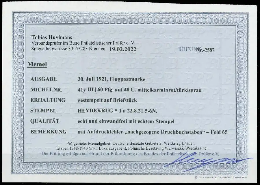 MEMEL 1921 Nr 41yIII zentrisch gestempelt Briefst³ck ATTEST 472D1A