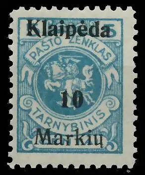 10 M auf 5 C Wert aus der Freimarkenausgabe von Litauen (nicht ausgegebene Dienstmarken) mit Aufdruck "Kleipeda", Schrift gerade und kursiv, ohne Aufdruck Memel und Doppelbalken