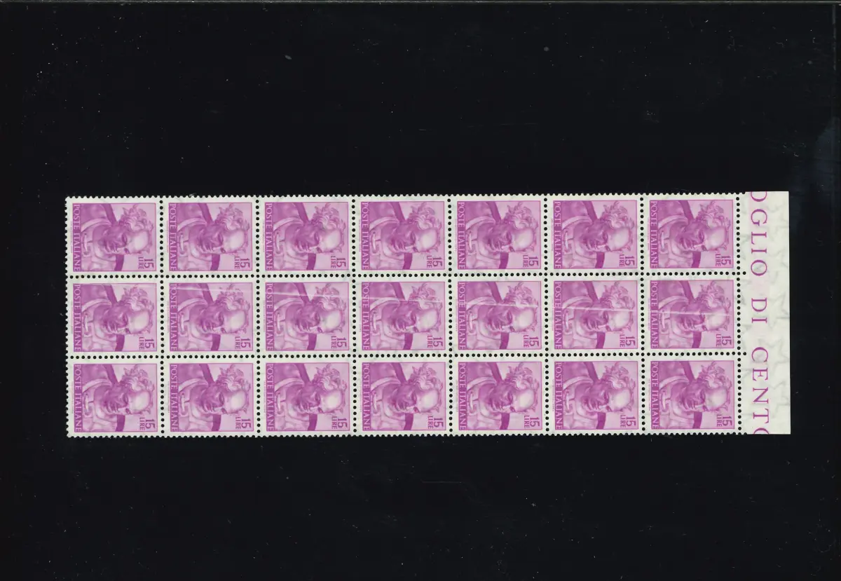 MNH - Vollgummi - MICHELANGIOLESCA 15 L. BLOCK VON 21 VERTIKALEN WEISSEN ZEILEN AUF DEM MITTLEREN STREIFEN Cod. ITAV_1590