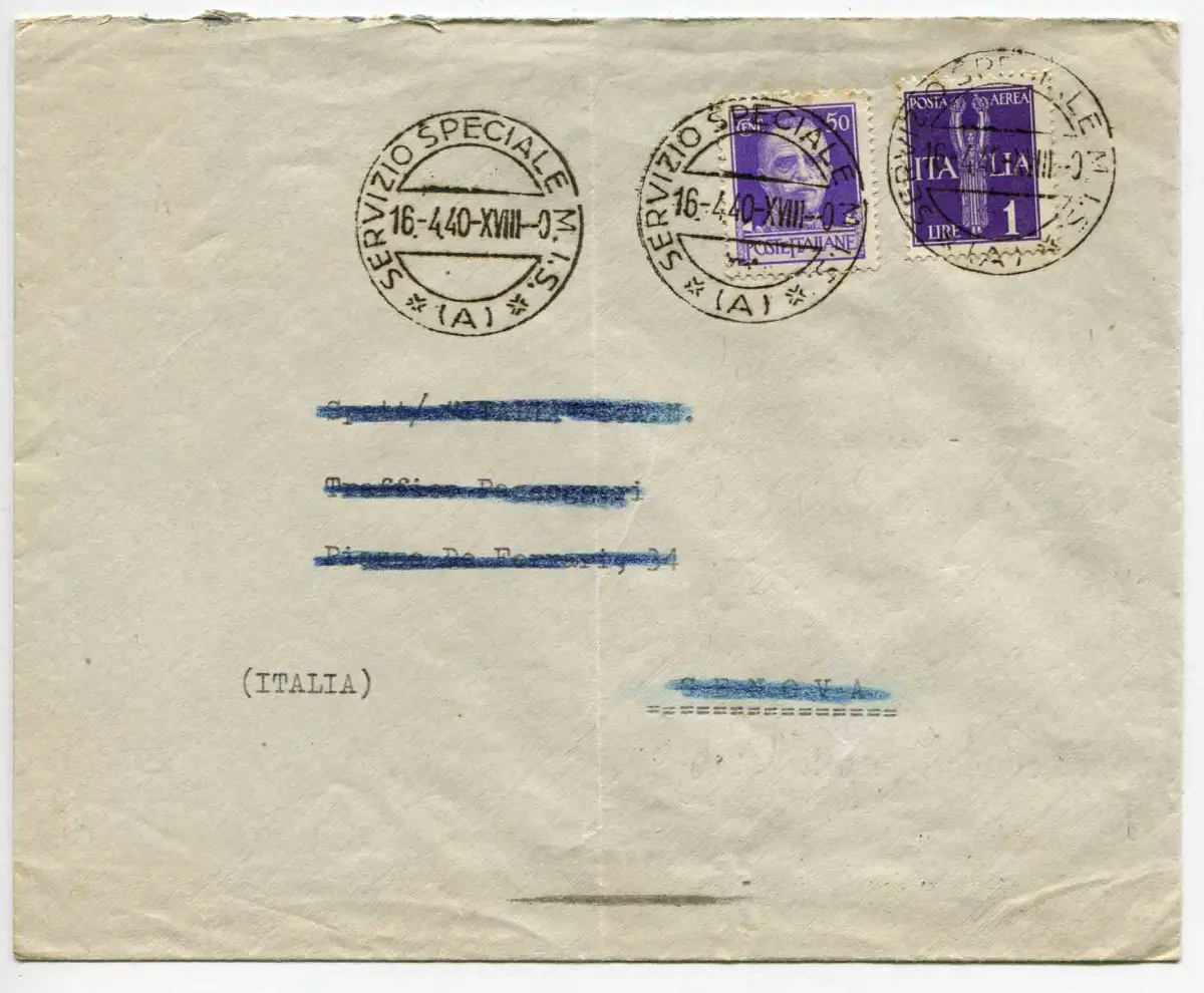 M.I.S. Sonderservice (A) - Luftumschlag nach Genua - M.I.S. Sonderservice (A) - Umschlag auf dem Luftweg nach Genua am 16.4.40 frankiert mit P.O. Nr. 251 + P.A. Nr. 14 gestempelt mit speziellem Guller der italienischen Mission in Spanien - mittlerer gefalteter Umschlag und Empfängeradresse mit blauem Bleistift Nr. 14 gelöscht. 167/5