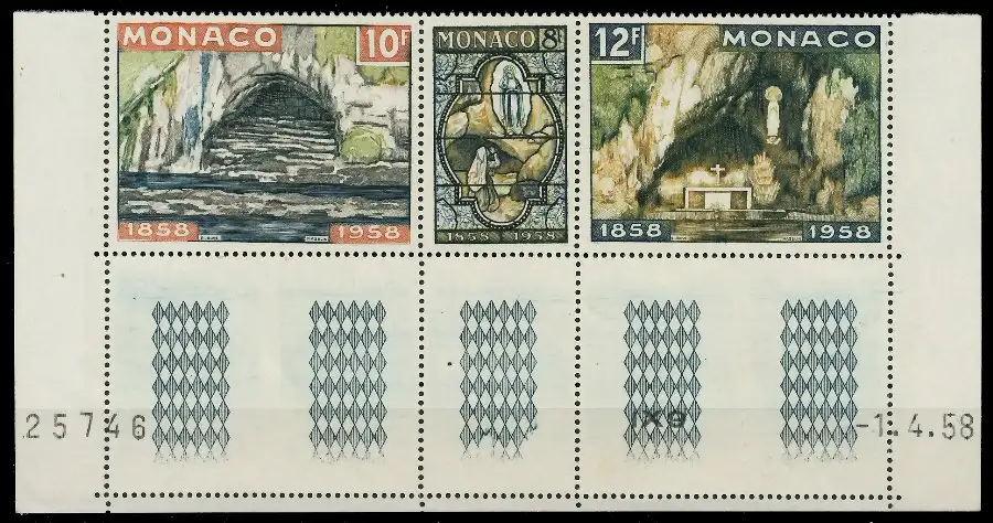 8 Fr. + 10 Fr. + 12 Fr. Wert aus der Ausgabe 100. Jahrestag der Marienerscheinung in Lourdes zusammenhängend im 3er Streifen mit kompletten Leerfeldern am Unterrand, mit Bogennummer, Druckerzeichen und Druckdatum, in den Eckspitzen unten rechts und links jeweils Haftspuren.