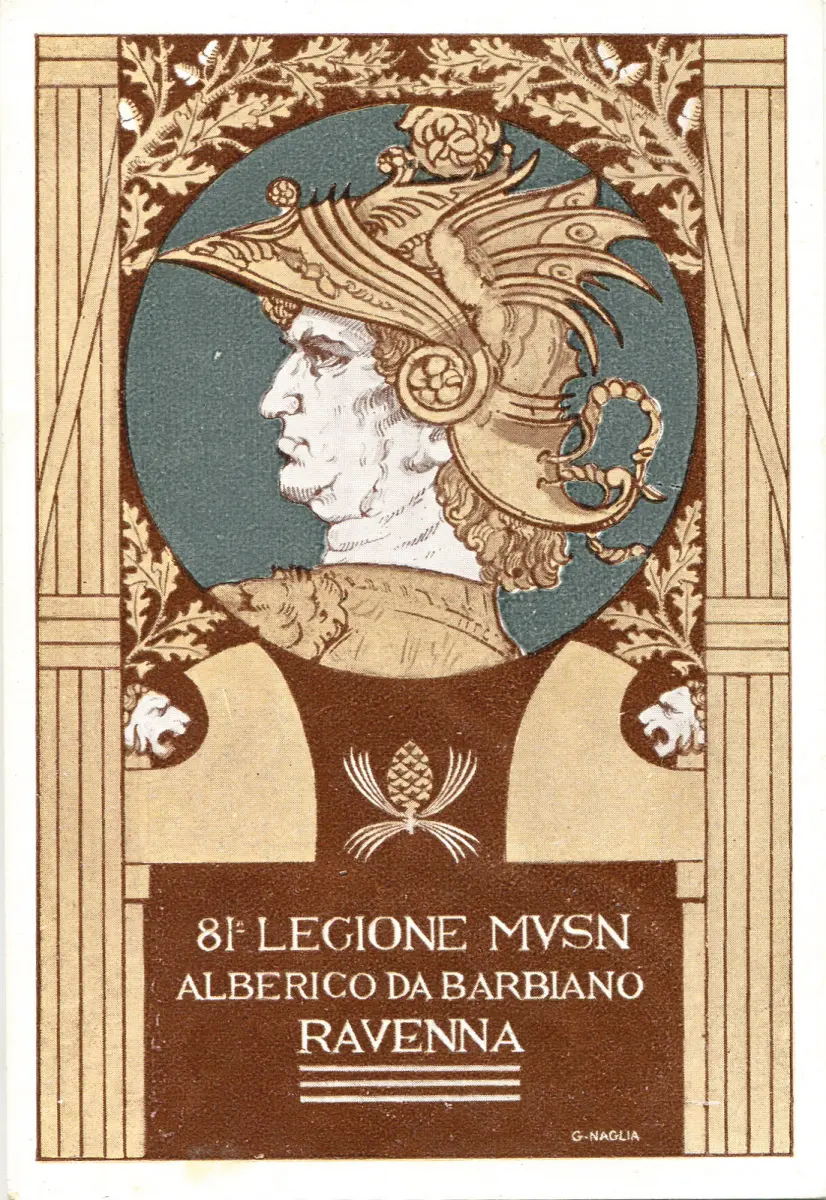 M.V.S.N. 81. Legione Alberico da Barbiano Ravenna Postkarte - M.V.S.N. 81. Legion Alberico da Barbiano Ravenna Postkarte gezeichnet von G. Naglia - neu in sehr gutem Erhaltungszustand - Selten - Bewertung Kat. Arrasich Euro 250 Cod. 58/14
