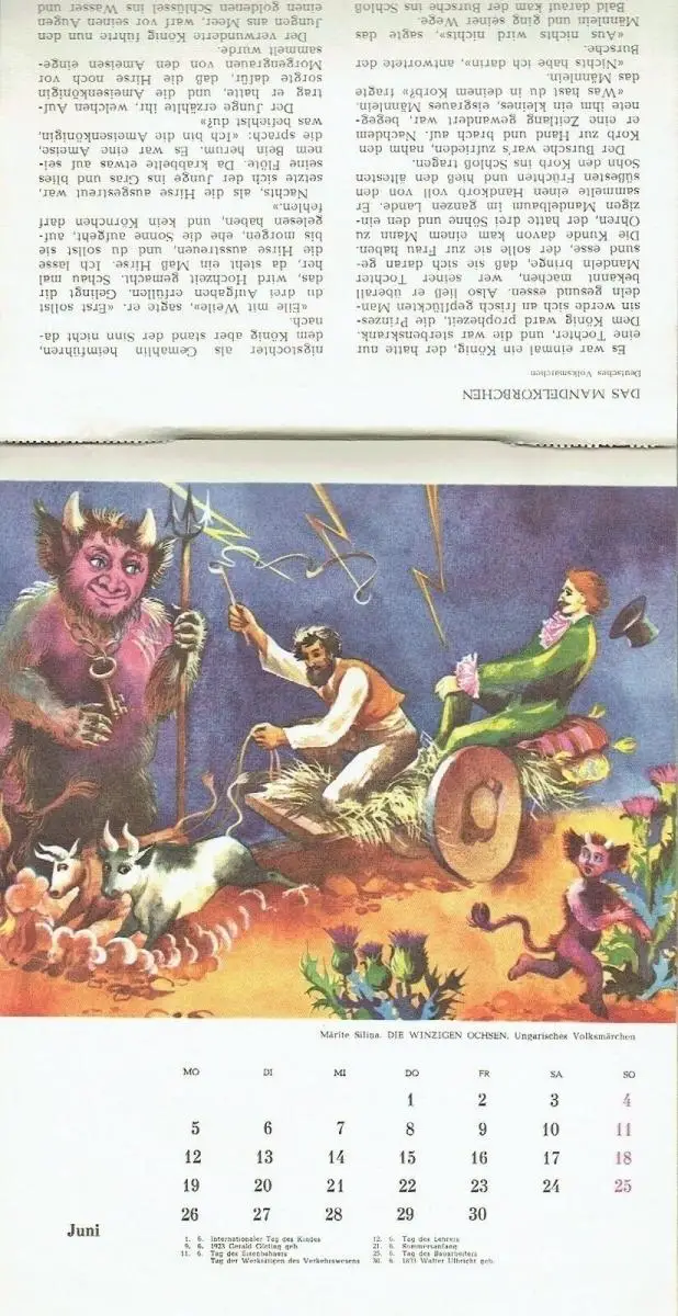 guter Zustand, Gebrauchs- und Alterungsspuren: Umschlag teils etwas abgenutzt und leicht verschmutzt - Deckblatt links oben mit kleinem Aufkleber - Kalenderblätter vollständig, überwiegend sauber und ordentlich, am unteren Rand teils leicht knittrig - einige links in der Perforation etwas gerissen - Juli-Blatt links eingerissen und durchscheinend geklebt, enthält 12 Märchen, liebevoll illustriert - Das bunte Hühnchen - Lettland - Die Wildgänse - Russland - Der Bauer und der Wolf - Ukraine - Der brave Spatz - Tadshikistan - Das Mandelkörbchen - Deutschland - Die winzigen Ochsen - Ungarn - Die Schätze des Necken - Slowenien - Nixe Goldhaar - Rumänien - Das Mädchen aus dem Kranichnest - Japan - Aschenpeter und das graue Mäuschen - Schweden - Die Steinsuppe - Italien - Der große Taler - Afrika, kartoniert, ca. 21,5 x 29, Deckblatt, 12 Kalenderblätter und kartonierte Rückseite, komplett
