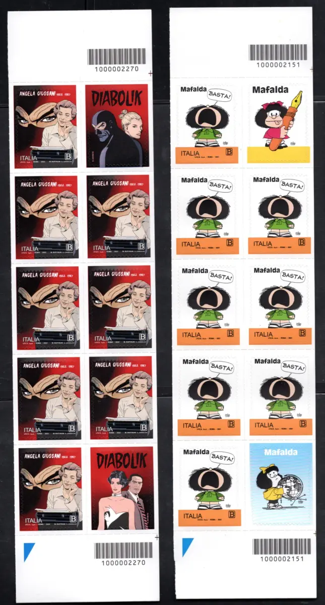 Ausgabe gewidmet Mafalda und Angela Giussani in vertikalen Blöcken von acht Briefmarken und zwei Erinnofili und Barcode - Blöcke rechts Cod. 1703 / WEB