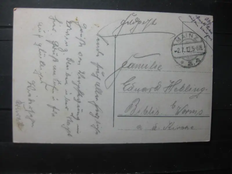 ca. 1917; Unschärfen, Spiegelungen, Verbiegungen sind allein durch das abfotografieren bedingt; Karte ist beidseitig abgebildet, Erhalt siehe Scan; ist das Foto qualitativ nicht aussagekräftig genug, kann es besseres Foto angefordert werden. Rückgabe bei Karten ist generell ausgeschlossen.