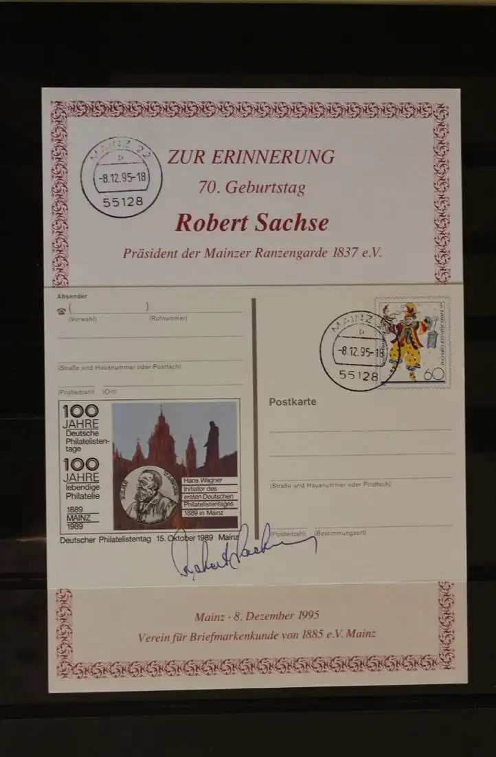 Seltener Beleg; Sonderblatt zum 70. Geburtstag des Präsidenten der Mainzer Ranzengarde mit Originalunterschrift.